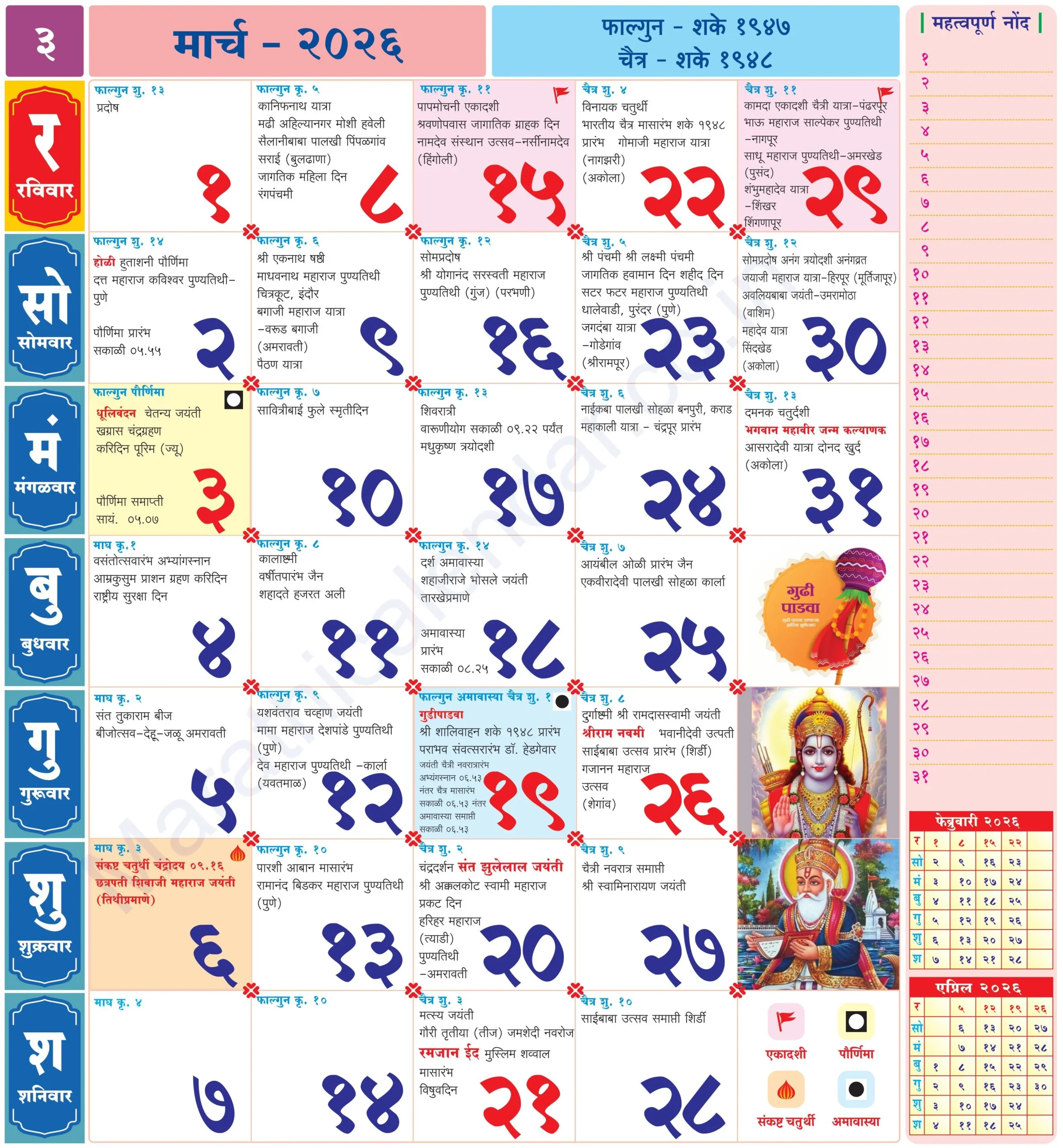 Welcome All! The Marathi Calendar 2026 March (मराठी कॅलेंडर २०२६ मार्च) Free pdf can be downloaded here.